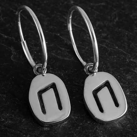 A pair of Rune silver hoop earrings. These earrings comprise of a rounded rectangular pendant charm with a cutout in the shape of a Runic symbol. The charms have a smooth, shiny finish that emphasises their elegant, minimalist design.