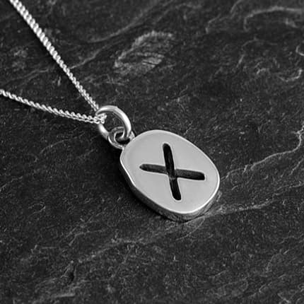 It measures 14mm across and has an oxidised finish on the rune. The sterling silver curb chain measures 18 inches in total length; other lengths available on request.