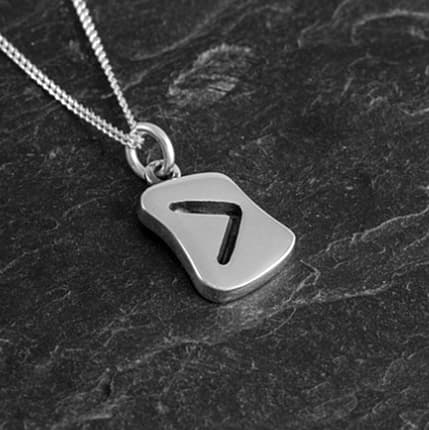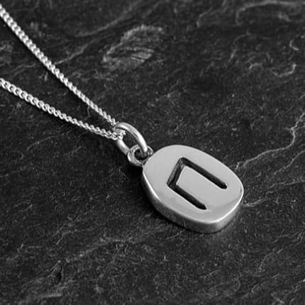 A Rune silver necklace with a silver curb chain. The necklace comprises of a rounded rectangular pendant charm with a cutout in the shape of a Runic symbol. The charm has a smooth, shiny finish that emphasises its elegant, minimalist design.