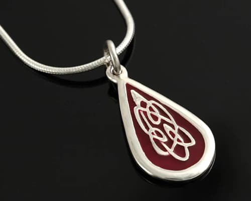 This Celtic necklace features a teardrop-shaped design with a polished silver frame. Inside the drop is a deep red enamel background, overlaid with an intricate silver Celtic filigree-style pattern that creates an elegant, flowing motif. The combination of the rich red interior and shiny silver detailing gives the piece a refined, artistic look. It hangs from a sleek silver bail attached to a smooth, rounded chain. A striking yet refined piece for any jewellery collection with artistic charm.