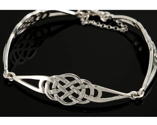 A beautifully handmade silver bracelet featuring an intricate Celtic knot design at its centre. The knot is woven with multiple interlacing loops, creating a symmetrical and continuous pattern characteristic of traditional Celtic artistry.