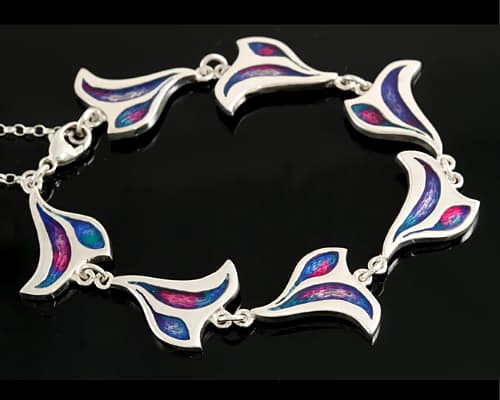 A beautiful handmade sterling silver link-style bracelet consisting of seven enamelled pendants, each featuring a coloured, enamelled background that resembles the northern lights. The attention to detail on the pendants feature a shimmering purple and blue pattern.