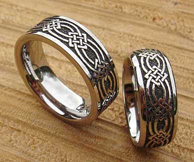 This ring will wear very well for a wedding ring, and the designer has advised us that the engraving for this ring takes an hour to complete. The engraved surface itself is quite textured, therefore adding to the ancient Celtic symbolism depicted. The ring's width is 7mm, and it is available in a satin or polished finish. It is pictured below in both a domed (as featured on this page) and a flat profile for a Celtic wedding rings set. The flat profile version of this ring is also available on our website in this section.