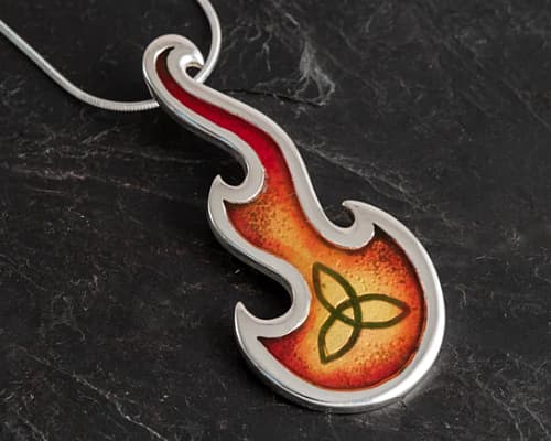 This Celtic necklace features a bold flame-shaped design outlined in polished silver. Within the flame, a gradient of fiery colours, deep red, orange, and golden yellow, creates a vivid enamel finish with a textured appearance. At the centre of the lower flame sits a clean triquetra, adding a Celtic, spiritual, or elemental touch. The shape curves and flows like rising fire, giving the piece an energetic and dynamic feel. The pendant hangs from a sleek snake chain, enhancing its modern, striking aesthetic.