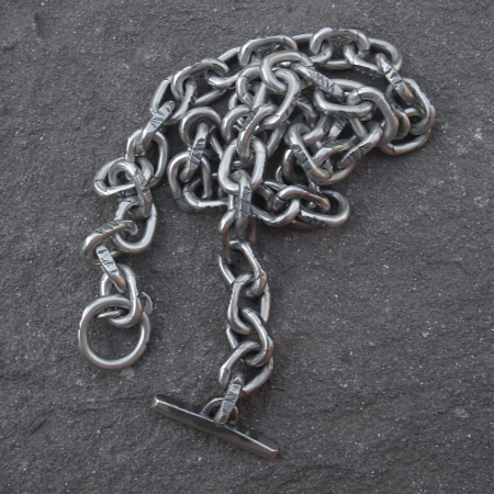 A very attractive, handcrafted chunky chain necklace for men made from solid sterling silver with a T-Bar fastening. This design is yet another example of a distressed urban look that is very fashionable for mens silver jewellery. It features a scarred textured surface for that off the shelf urban feel.