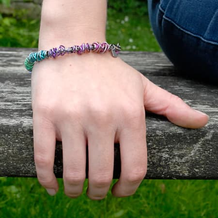 Bold, edgy, and full of character, this titanium wire wrap bracelet is designed to stand out. Featuring a series of densely layered natural grey and black coiled wire elements, the bracelet creates a dynamic, textured look inspired by industrial design and organic movement. Each section is carefully arranged to form a chaotic pattern in which smooth titanium rings and darker elements intertwine, giving the piece depth, contrast, and a unique tactile feel. No two angles look quite the same, making it an eye-catching addition to any outfit.