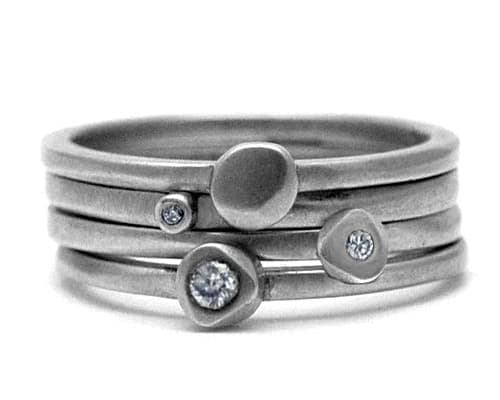 A silver stacking ring set comprising multiple slender, matte silver bands, designed to be worn stacked together. Each band features a small, organic-shaped element, soft, rounded pebble-like forms, some set with sparkling, clear stones that catch the light beautifully, while others are left smooth for a balanced, organic feel. The stones vary in size, giving the arrangement a natural and effortless feel. The overall look is modern, minimalist, and slightly earthy, blending clean lines with asymmetrical, handcrafted charm. Modern, minimal, and perfect for everyday wear, this elegant stacking ring set includes multiple slender silver bands, each adorned with softly shaped pebble-like accents.