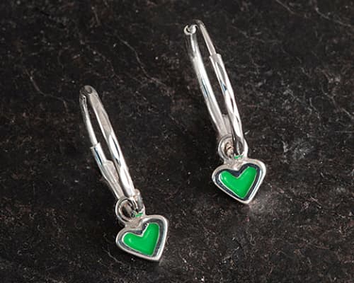 A cute set of hoop earrings made from sterling silver that come in the form of a small heart with green enamel finishing. Lovely attention to detail, reminding us of springtime and summer days.