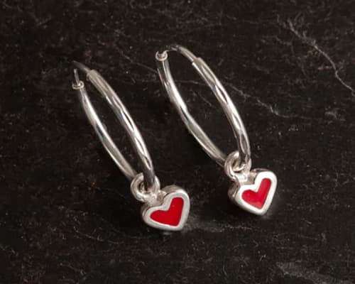 A cute set of hoop earrings made from sterling silver that come in the form of a small heart with red enamel finishing. Lovely attention to detail, reminding us of springtime and summer days.