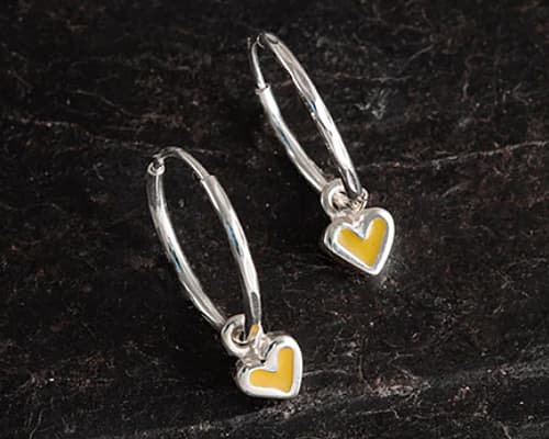 A cute set of hoop earrings made from sterling silver that come in the form of a small heart with yellow enamel finishing. Lovely attention to detail, reminding us of springtime and summer days.