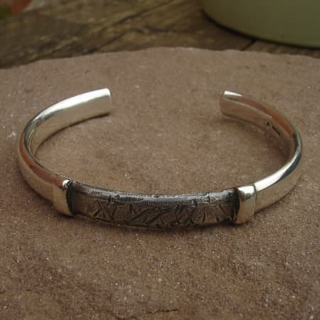 The bracelet is about 8mm wide and 4mm in thickness. The silver comes in a lovely contrasting finish with a central dark oxidised area that is divided from the non-oxidised silver by attractive ridges. The entire piece has a scarred handmade finish which we know is popular on the streets these days for men, giving this particular designer cuff bracelet that distressed urban feel. The weight is approximately 49 grams.