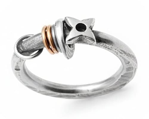 This ring features a handcrafted, industrial-inspired design made from oxidised sterling silver with a rugged, textured finish. The focal point is a star-shaped bolt head with a circular opening in the centre, giving it a distinctive mechanical look. Beside it sit several small mixed-metal accent rings in red gold and silver, adding warmth, motion, and contrast. The band itself has an organic, subtly hammered appearance that enhances its artisan, hand-forged character. The overall style blends industrial hardware aesthetics with wearable, contemporary jewellery design. The ring is handmade from 3mm round wire, and the star measures approximately 7mm across.