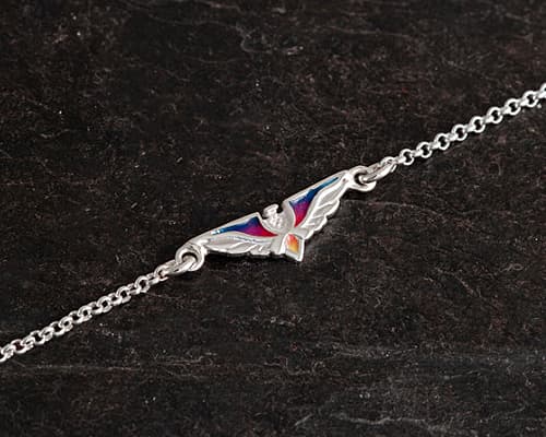 A handmade, dynamic, sterling silver chain bracelet for women featuring a colourful eagle-shaped pendant. The eagle design is beautifully detailed with vibrant enamel inlays blending shades of deep blue, purple, red, and golden yellow, creating a striking, fiery gradient also reminiscent of a phoenix or celestial bird.