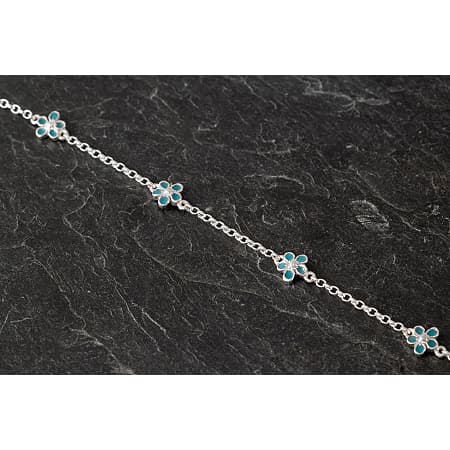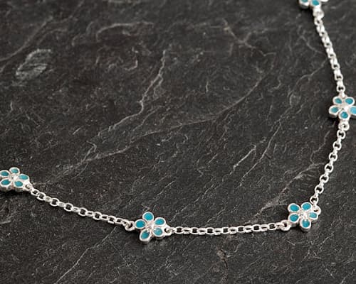 This elegant forget-me-not necklace is handmade in sterling silver. It features five delicate enamel flowers in a repeating pattern, evenly spaced along a silver chain when worn around the neck. Each flower has five rounded petals and is detailed with soft blue enamel petals, capturing the gentle beauty and symbolism of the forget-me-not, often associated with remembrance, love, and lasting connection. They each have a tiny silver centre, giving the flowers a gentle, dainty look.