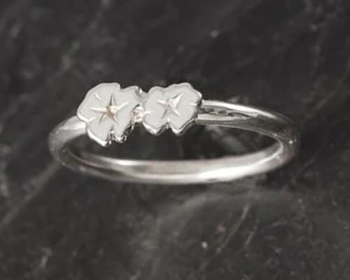 This stacking ring features a slim, polished silver band topped with two flower-shaped designs arranged in a row. Each flower has a softly rounded silhouette with a subtle star-shaped detail engraved at the centre, giving the design a delicate, handcrafted look. The overall style is feminine, minimal, and elegant. This stacking ring is perfect for everyday wear or as a delicate stacking piece. Inspired by tiny blossoms at first bloom, this sterling silver ring showcases two delicate flowers with star-kissed centres.