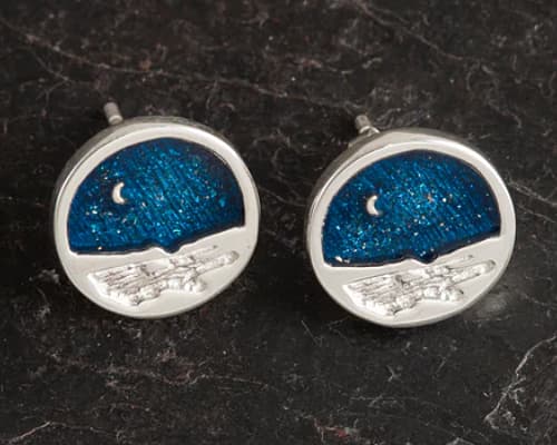 A pair of exquisite stus earrings handcrafted in the Shetland Isles, just north of Scotland. The earrings feature a landscape-style design with a coloured dark blue enamelled background that resembles the night sky. The attention to detail includes a distant star pattern and a crescent moon.