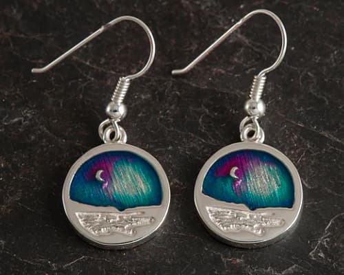 A pair of exquisite drop earrings handcrafted in the Shetland Isles, just north of Scotland. The earrings feature a landscape-style design with a coloured, enamelled background that resembles the northern lights. The attention to detail includes a shimmering pattern.