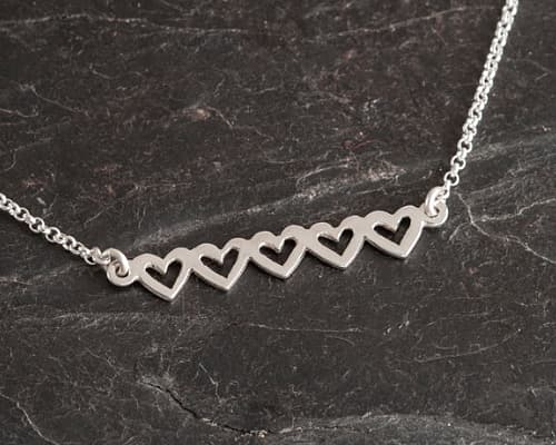 Celebrate love in all its forms with this elegant five-heart silver necklace. A delicate silver chain necklace with a horizontal row of five interlinked, open-frame heart shapes. Each heart is identical in size and connected seamlessly to form a clean, modern, minimalist bar pendant. The polished silver finish gives it a sleek and reflective look, making it suitable for everyday wear or as a subtle romantic accessory.