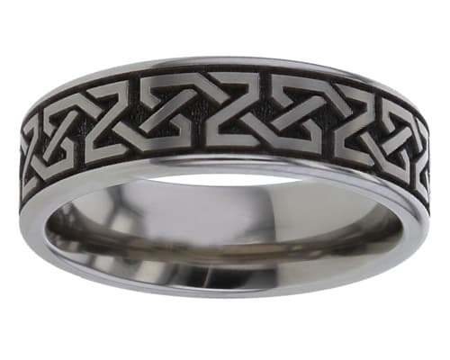 This Celtic titanium ring is another example of the outer engraved Celtic titanium rings we sell. Rather than being very detailed, it features a perfectly laser-engraved geometrically engineered Celtic Knot design that sits proudly on the pitted titanium. The woven pattern is interlaced, repeating right around the entire ring. The ring's edging has a slightly rounded profile that catches the light and is flat in profile. All in all, a very stylish, understated, and modern Celtic ring.