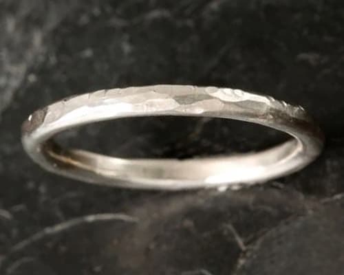 A simple, slender silver ring featuring a hammered texture. The surface shows small, irregular facets created by hand-hammering, giving it a rustic yet refined look. The finish is matte with subtle shine, and the overall design is minimalist and unadorned. It has an organic, handcrafted aesthetic. A beautifully minimalist hammered silver ring, hand-forged for a unique organic texture.