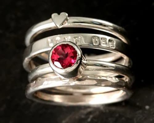 A stacked set of silver rings, each with its own unique design. The main ring features a bezel-set pink Topaz. Another is a plain polished silver band with a textured, hammered finish. We also have one band with a small raised heart charm attached to the top, and finally, one band features stamped letters for artisanal completeness. Together, the rings create a layered, handcrafted look, part bohemian, part romantic and part minimalist. These stacking rings offer a beautiful variety and artisan charm. A perfect everyday set or meaningful gift. Fall in love with this sterling silver stacking ring collection, handcrafted to tell a story.