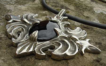 Here we have a large pewter pendant with a black onyx cabochon stone. This piece is sizeable measuring 115mm wide and 85mm tall. The rubber thong measures 18 inches and its total weight 160g.