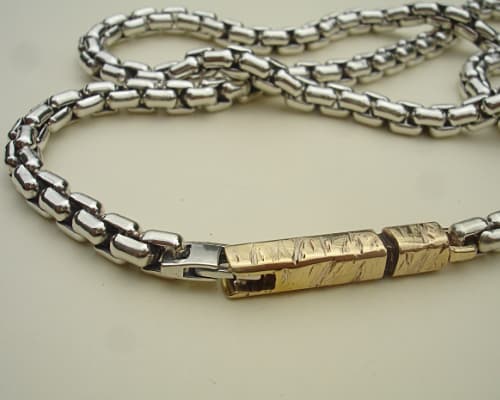 This mens designer chain necklace is one of the heaviest mens chains we feature. It consists of 6mm square sterling silver belcher chain links and a 6mm x 30mm solid brass bar catch. The total length is 18 inches.