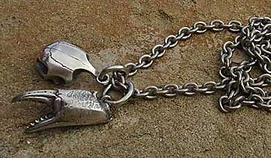What we have here is a beautifully handcrafted and unique skull and crab or lobster claw silver men's necklace on a titanium chain. The silver comes intricately carved with oxidised detail, and the attention to detail is superb. The skull measures 20mm x 15mm and the crabs claw measures 25mm x 12mm. It comes on a titanium chain which measures 20 inches long.