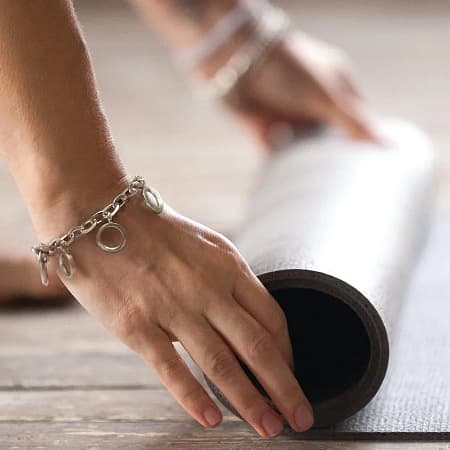 A solid sterling silver charm bracelet featuring a series of open circular ring charms. The design consists of medium-weight oval chain links, with several smooth, polished rings hanging freely as dangles. The aesthetic is minimalistic yet playful, giving the piece a modern, industrial, and slightly bohemian feel. Lightweight, easy to style, and suitable for everyday wear. The bracelet showcases a series of polished open circles that sway gently on a sleek 6mm chain-link band. The minimalist ring charms create a modern, airy look that is easy to wear and perfect for layering. Sophisticated yet playful, a versatile piece that complements any outfit.