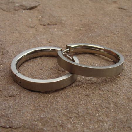 A pair of natural coloured titanium full hoop earrings measuring 24mm in diameter and 3mm wide. They also come in other anodised colours too, and each one features a secure hinge and locking catch that clicks in well making sure that they never get lost.