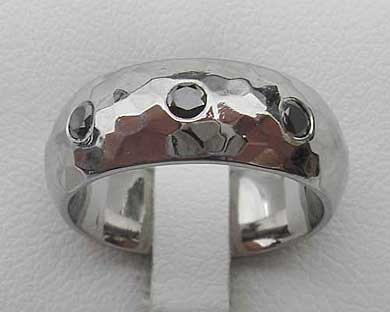 A hammered finish domed profile diamond wedding ring made from titanium set with three 2.5mm (6pt) black diamonds that shine. The polished finish works very well with the hammered surface in a way in which it reflects the light from the surface in a unique but also lovely manner. The ring is available in widths of 5mm, 6mm or 7mm in a satin or a polished finish as previously mentioned.