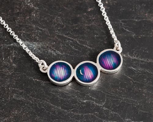 This unique necklace features three round enamelled pendants arranged side-by-side in a 30mm-long horizontal trio. Each pendant displays a vibrant, iridescent pattern in shades of deep blue, purple, and hints of pink, resembling a galaxy or shimmering aurora. The centre pendant has a crescent moon. The enamel is set in polished silver frames and connected seamlessly as a single design. Attached to a silver chain, the piece has a modern, celestial, and artistic feel.