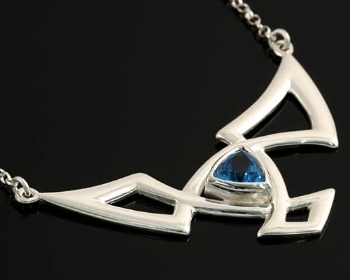 This unusual necklace features a striking geometric design in polished silver, arranged in a bold, symmetrical shape. The structure is composed of angular, openwork elements that form two outward-sweeping wings connected to a central motif. At the centre sits a blue topaz, set in a smooth silver bezel. Its triangular shape complements the pendant's sharp, contemporary lines and adds a vivid pop of colour.
