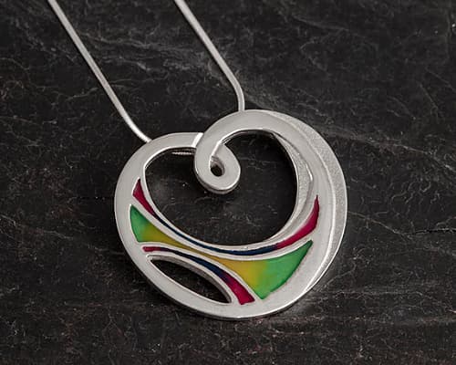 A handmade sterling silver chain necklace featuring a stylised heart with colourful rainbow enamelled detail. These expressive necklaces feature a modern, artistic heart-inspired design crafted in polished silver. It forms an abstract, open heart shape with a smooth, flowing contour. A small loop at the top integrates seamlessly into the heart, giving the design an elegant, continuous feel. Along the lower curve of the heart is an inlay of vibrant, multicoloured enamel, blending hues of purple, pink, yellow, and green.
