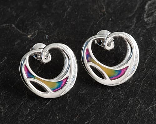A set of unusual stud earrings handmade from sterling silver in the shape of stylised hearts with colourful rainbow enamelled detail. These expressive earrings feature a modern, artistic heart-inspired design crafted in polished silver. Each earring forms an abstract, open heart shape with a smooth, flowing contour. A small loop at the top integrates seamlessly into the heart, giving the design an elegant, continuous feel. Along the lower curve of each heart is an inlay of vibrant, multicoloured enamel, blending hues of purple, pink, yellow, and green.