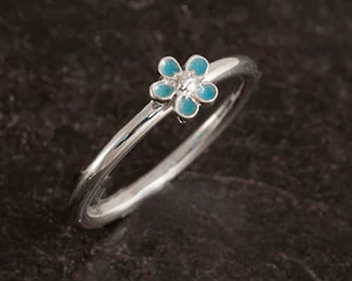 A pretty silver ring in a rounded wire profile. The ring features a small flower design on top, with five light blue petals and central silver detailing. The forget-me-not is a striking little blue flower that, through the ages, has symbolised true love, fidelity and loyalty to lovers, friends and family. Its very name reinforces the message of staying in someone's memory forever.