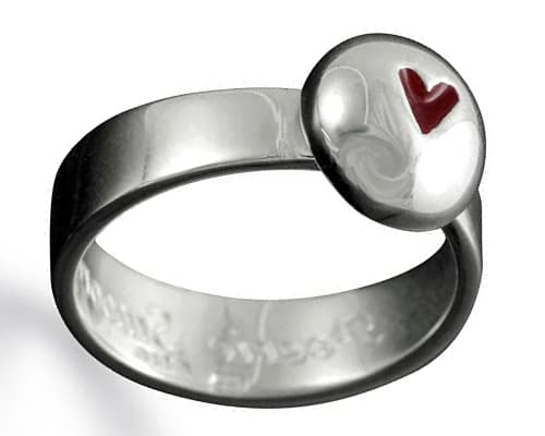 This womens fashion ring features a smooth, polished silver band with a rounded, domed top. At the centre of the dome is a small red heart enamel inlay, creating a simple yet striking accent. The design is modern and minimalistic, with a subtle romantic touch. Sweet, simple, and perfect for everyday wear. Its clean lines and contemporary silhouette make it a subtle yet meaningful piece, ideal for stacking or wearing on its own.